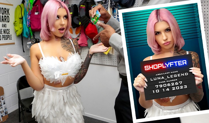 Розоволосая Луна Леджент в базе магазинных воровок совсем недавно, но она там есть. Ну и как может быть иначе, если девушка при задержании отстаивает свою честь и трахается с главным охранником, но не дает ему при этом трахнуть себя в попу, зато в другие дырки вполне... да еще и получает оргазм при этом. Похоже теперь розоволосой красотке придется идти за адвокатом, а потому добиться со всеми уже в туза.