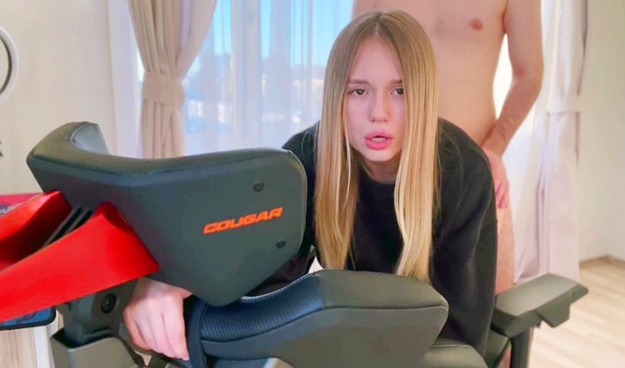 Все девушки любят подарки, а Аллиника особенно. Вот поэтому сегодня любимый парень дарит девушке супер крутое компьютерное кресло, о котором та давно мечтала. Горя желанием отблагодарить товарища, девица встает в позу раком на этом самом кресле и принимает между ног большую висячку друга. Перевернувшись на спину, она раздвигает ножки и продолжает секс в классической позе, после чего принимает сперму в рот. А оказывается еще за ним можно играть в компьютер.