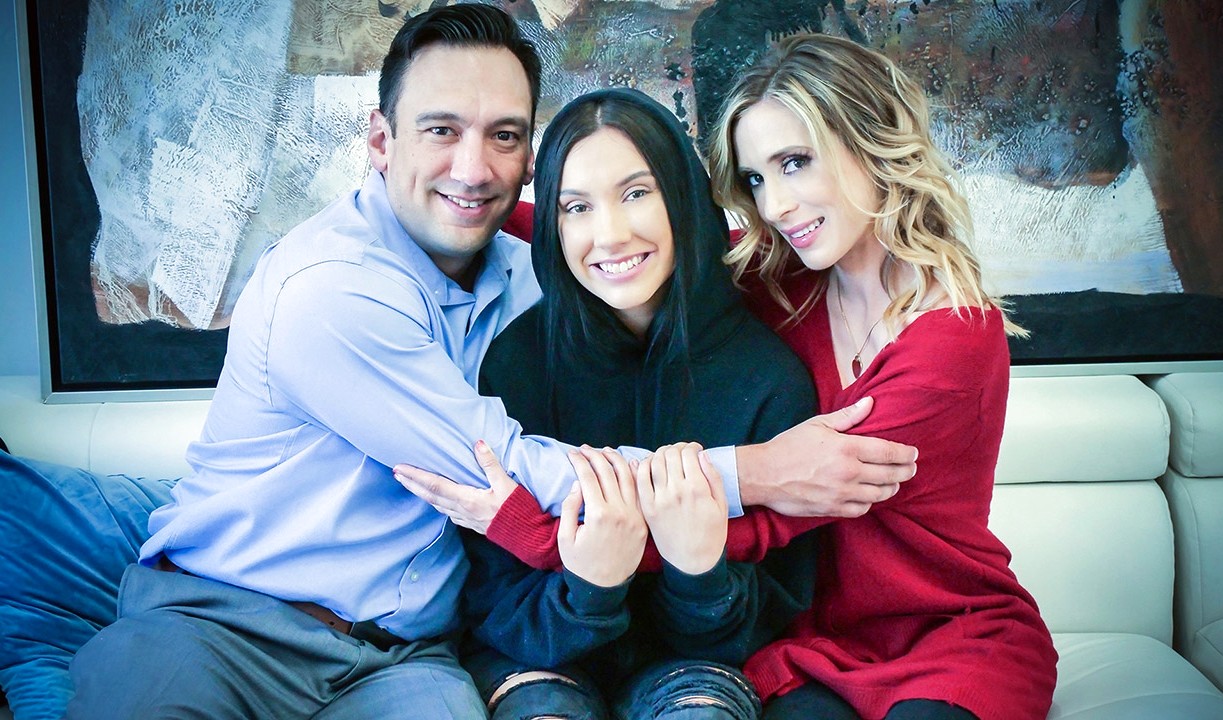 Симпатичную студентку по обмену молодая семья выбирала долго и тщательно и таки не ошиблась. Красивая брюнетка очень быстро нашла общий язык с женушкой, занявшейся с ней лесбийским сексом, а после и с главой семьи, классно отсосав тому большой член. Зато теперь групповой секс частое и очень любимое развлечение для троицы.